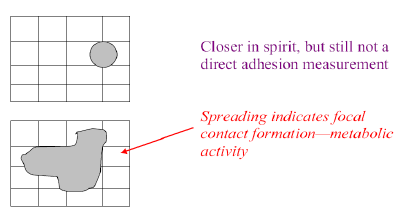 | Cell Spreading Assays | 1. cell type on surface at given DENSITY for specified time 2. Mesaure: INCREASE projected surface area (optical microscopy) spreading indicates focal contact formation, metabolic activity # SPREAD |