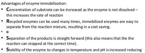 | List 3 ways in which enzymes can be immobilised. | Aggregations of enzymes bonded together Attached to surfaces, e.g. glass Entrapped in gels, e.g. alginate gel beads |