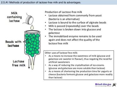 | Outline the process by which lactose-free milk is produced? immobilised enzymes |
