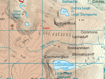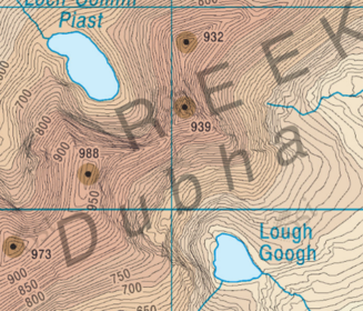 | Arete Glacial erosion Thin piece of high ground that separates one corrie/tarn from another. Contours packed tightly. Brown color. | |
