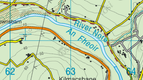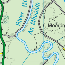 | Levee Raised banks of earth beside the river channel. Spot heights and contour lines show them. Old stage of river. | |