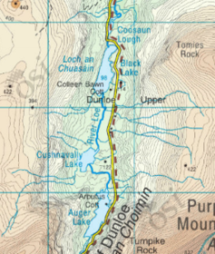 | Ribbon lakes AKA Paternoster lakes Glacial erosion Plucking & Abrasion Found in U shape valley floor (Green). Steep sides (Tight contours & Brown colour) Lakes connected by a River Trellised Drainage pattern | |