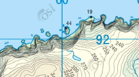 | Sea cliff Coastal deposition Light/brown color. Tightly packed contour lines. Spot heights. Near sea/ocean | |