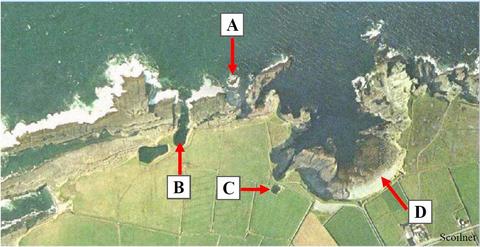 | A= Sea stack B=Sea Arch C= Blow hole D = Beach/Bay | |