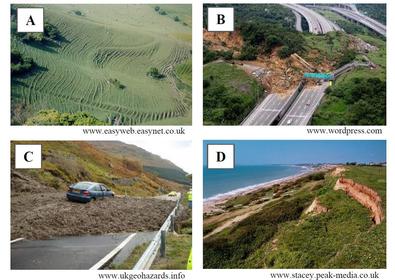 | A= Terracettes B= Landslide C= Mudflow D= Rotational slump | |