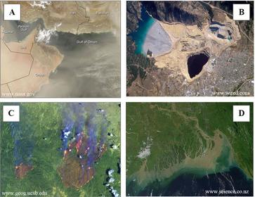 | A= Sandstorm B= Open cast mining C= Forest Fire D= Delta | |