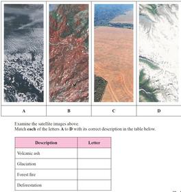 | A= Volcanic ash B= Forest Fire C= Deforestation D= Glacier | |