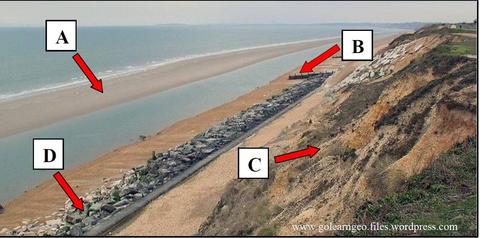| Groyne Offshore bar Cliff Rock armour | A= Offshore bar B= Groyne C= Cliff D= Rock armour |
