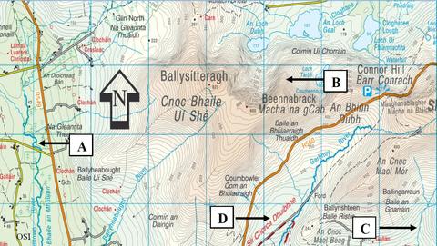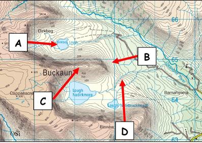 | A= Tarn B= Truncated spur C= Arete D= Hanging Valley | |