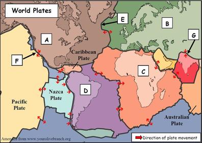 | A= North American B= Eurasian C= Africian D= South American E= Constructive/Divergent F= Transform G= Destructive/Convergent | |