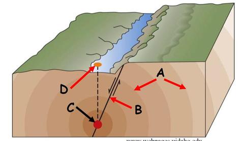 | A= Tremors B= Fault line C= Focus D= Epicenter | |