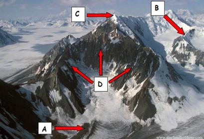 | A= Later moraine B= Arete C= Pyramidal peak D= Corrie | |