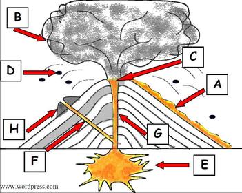 | A= Lava B= Ash cloud/gas C= Crater D= Pyroclastic material E= Magma Reserve F= Secondary vent G= Vent H= Parasitic cone | |