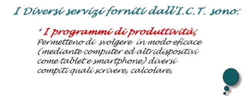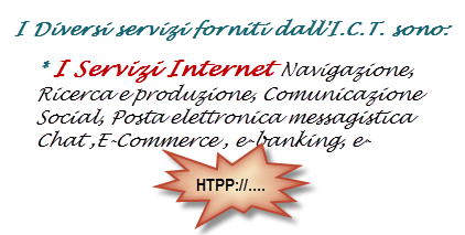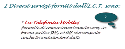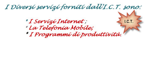 | Si definisce ICT (Information and Comunication Tecnology, " Tecnologia dell'Informazione e della Comunicazione ") un insieme vario di TECNOLOGIE atte a ELABORARE e TRASMETTERE le INFORMAZIONI. | |