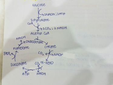 | Product formed during Krebs cycle | •Oxaloacetate (regenerated for krebs cycle) •6 NADH (for o.p.) •2 FADH2 (for o.p.) •2 ATP (formes from substrate level phosphorylation) •4 CO2 (exhaled frm lungs) |