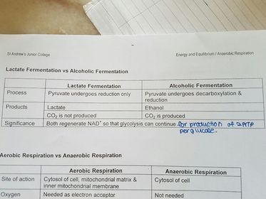 | Why would Krebs cycle and Link reaction be blocked during anaerobic respiration? | • Under anaerobic conditions, no 02 to be the final electron acceptor, no FADH2 and NADH will transfer its H atoms to the Electron Transport Chain (ETC) hence no electrons donated. • Therefore no regeneration of FAD and NAD+ for link reaction and Krebs cycle. |