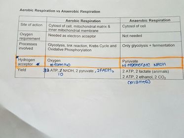 | Who is the hydrogen acceptor in aerobic and anaerobic repiration? | Aerobic: O2 to form H20 Anaerobic: Pyruvate to generate NAD+ |