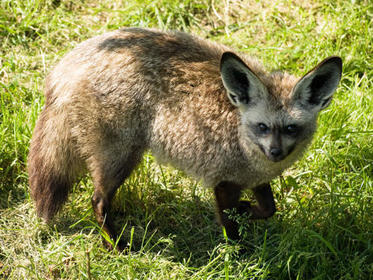| Большеухая лисица Большеухая лисица имеет необычно огромные уши по отношению к размеру головы. Окрас шерсти как правило, желто-коричневый, со светлой шеей и животом. Кончики ушей, лап и хвоста черного цвета. Конечности относительно короткие. | |
