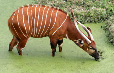| Бонго Бонго - это крупные и тяжелые лесные антилопы. У них темно-рыжая или каштановая шерсть с 10-15 вертикальными белыми полосами, которые спускаются по бокам. Самки, как правило, ярче самцов | |