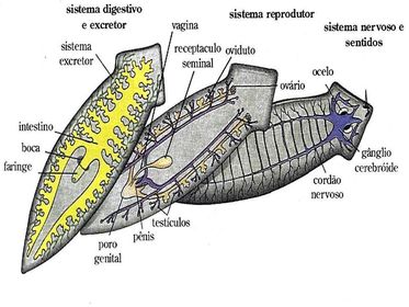 | - Sistema excretor - Locomoção | É constituído por protonefrídios, estruturas tubulares com células especializadas na coleta e remoção de excretas, denominadas células-flama. Para locomoção, possuem células epidérmicas produtoras de muco (glândulas) na porção ventral onde também são encontrados cílios. |