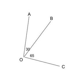 | If angle AOB measures 30 degrees, and angle BOC measures 65, what is the measure of angle AOC? | 95 degrees |