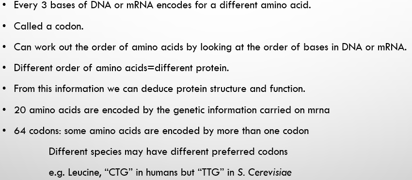 | RNA Types | - Messenger RNA (mRNA): conveys genetic information from DNA to the ribosome - Transfer RNA (tRNA): converts the genetic information into a sequence of amino acids -Ribosomal RNA (rRNA): catalytic and structural part of the ribosome |