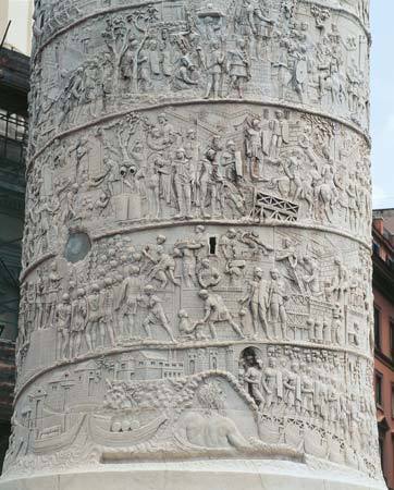 | Column of Trajan, dedicated in 112 CE, Rome, Italy * There was a column in between the libraries * Trajan died in 117 CE, his ashes were in the bottom of the column * It celebrates his victory over Dacia, modern Romania * Romans were cremating their remains * Christians buried themselves * 625 feet, 12 stories high * Historiated columns, showing reliefs of history on the side * Apolodorus might have had the idea * There was no precedent for it to be made * But the idea was super popular after * There are 2500 figures * It was painted to be more legible * The column stood between two buildings so you could see the top of the column from the second story * They added St Peter in the renaissance, but it used to be a statue of Trajan Rotulus, rotuli Scroll (rotating) * Trajan’s column looks like a scroll | |