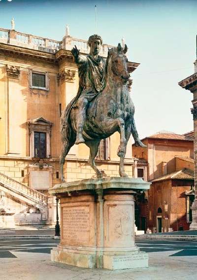 | Marcus Aurelius, 175 CE, Rome, Italy * Equestrian bronze original * Titus and Trajan’s bronze equestrians didn’t last * This is the only ancient equestrian monument of an emperor * 161-180 was his rule * He wrote the Meditations * He hated war but knew it was necessary * Marble statues of the emperors existed along with coins * But now bronze ones survive * Hadrian made full length statues, but most emperors’ statues were busts * The image of the emperor was circulated to remind people of him * Marcus Aurelius looks like he’s speaking * The horse is super realistic * Its 11 feet high * Its the prototype of all equestrian statues of great leaders * Its been moved inside now * The Roman Empire starts around 500 BCE * The last roman emperor is in 476 CE | |