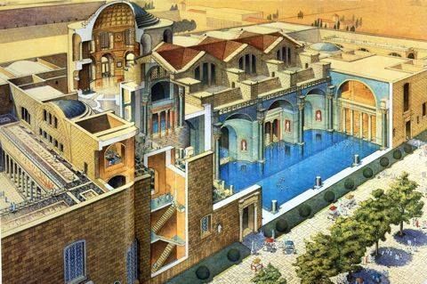 | Baths of Caracalla, 212-216 CE, Rome, Italy (plan and reconstruction) * There were 952 baths in Rome * 11 were private * There were 14 aqueducts flowing into Rome for them * Like a YMCA * You could bathe, swim, go to the gym, and even attend lectures * It covered 50 acres * 1600 people could bathe there * They liked to dip between temperatures of water * Tepidarium, calidarium, frigidarium * The calidarium was about the size of the pantheon * X on a plan means groin vault ceiling * Before pavoroti died he gave performances here * Men and women were separate | |
