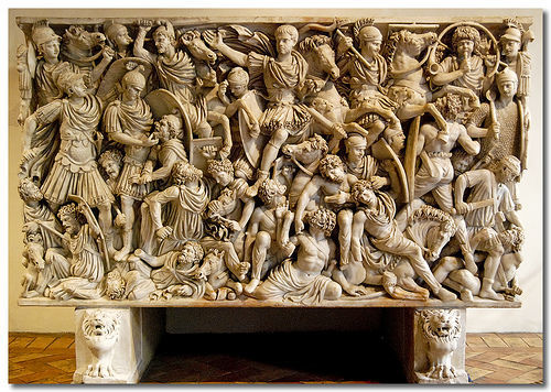 | Ludovisi Battle Sarcophagus, 250-260 CE * More and more people are burying rather than cremating * It was discovered in the renaissance * The Ludovisi family bought it * They called anyone against Rome Barbarians * The figures were probably Goths from France * Its super chaotic * The chaos in the Roman Empire itself is mirrored in its art * There’s a lack of order compared to Greece and earlier Rome * There’s civil war, almost every emperor is assassinated, money is devalued, everything is chaotic * The leader is likely the man in the center without his helmet | |