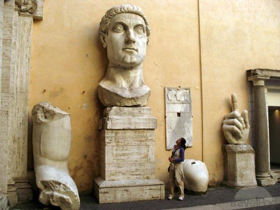 | * Constantine ruled from 306-337 * Diocletian had the idea to have four emperors * It was called the Tetrarchy * Constantine was the son of one of them * He chose to live at Rome * This head alone was 8 feet tall * The body was a wood core covered in bronze (bronze is gone now) * This sat in Constantine’s basilica * The eyes are very important in christian art * Like the Mesopotamian statues in awe * Constantine reverted to the idealism of Augustus * Later emperors continued the idealism * Around Hadrian their reverted to realism * Around the fall the emperors look tired * Verism returns | |
