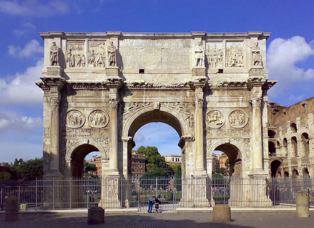 Arch of Constantine, 312-315, Rome, Italy * Maxentius was his co ruler but their relationship crumbled * They fought in 312 on the Milvian bridge and Constantine won * Constantine built his triumphal arch there * Constantine won the battle because he had a vision of a cross, and heard a voice saying “in this sign thou shalt conquer” * He takes it as a sign that he had to convert to win the battle * He does and wins, so the arch commemorates his conversion too * He gave legal status to the christians and pagan religions * Constantine belongs less to the roman empire than early christians |