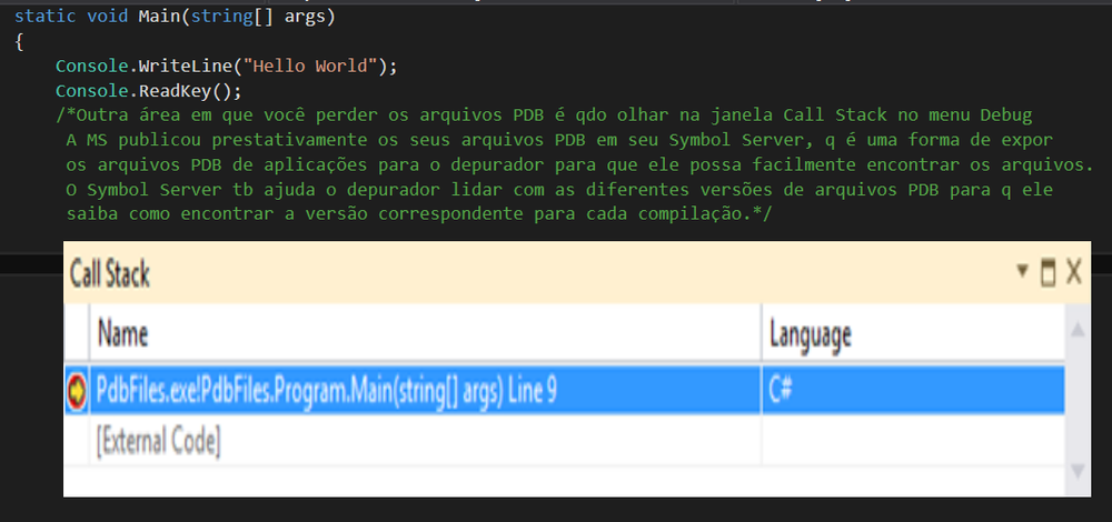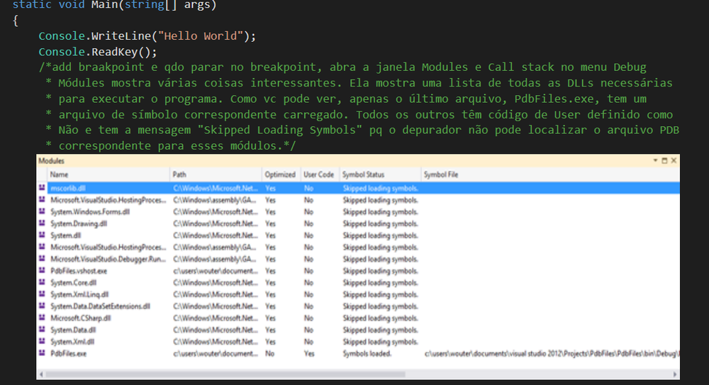 como o debugger localiza e utiliza o .pdb? Qdo vc carrega um módulo, o debugger (depurador) começa a olhar para o arquivo PDB correspondente. Ele faz isso procurando por um arquivo PDB com o mesmo nome que fica no mesmo diretório do aplicativo ou biblioteca. Qdo vc tem um MyApp.dll, o depurador procura por MyApp.pdb. Ao encontrar um arquivo com um nome correspondente, ele compara um ID interno q é criado pelo compilador. O ID, q é um identificador exclusivo global (GUID - global unique identifier), deve corresponder exatamente. Desta forma, o depurador sabe q vc está usando o arquivo PDB correto e pode mostrar o código-fonte correto para sua aplicação enquanto você está depurando.