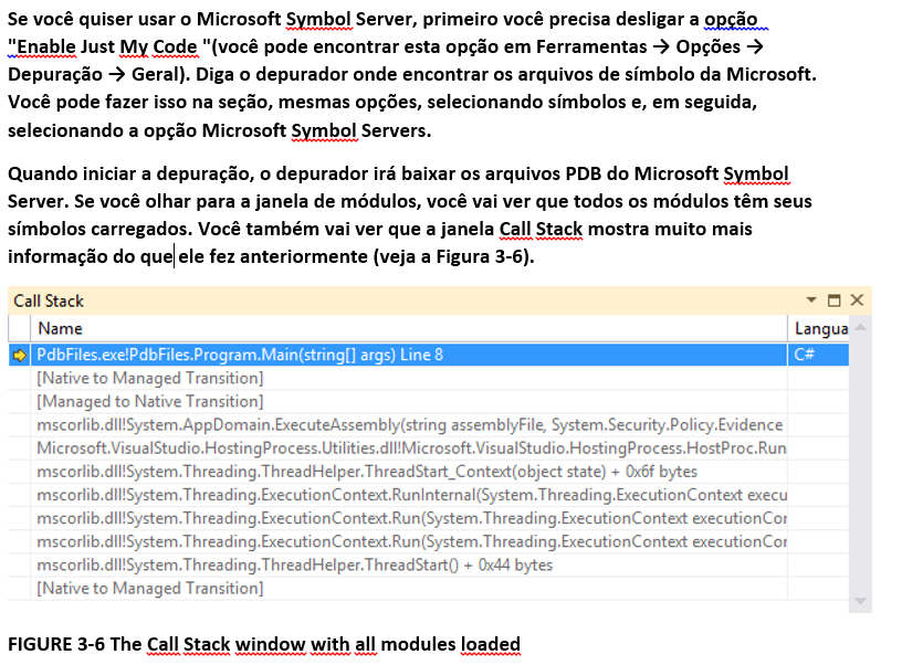 que informações contém aquivos .pdb? Um arquivo .NET PDB contém duas informações: ■ Nomes de arquivos fonte e suas linhas ■ Nomes de variáveis locais Esses dados não estão contidos nos assemblies .NET, mas vc pode imaginar como ele ajuda com a depuração.