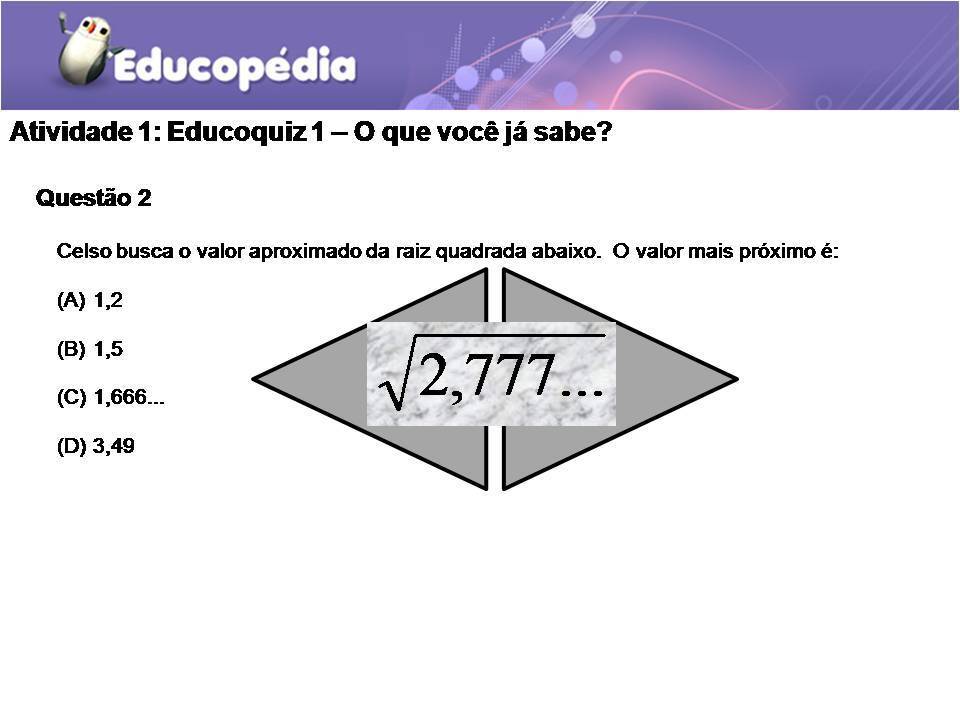 | Raiz quadrada aproximada Para calcular a raiz aproximada de um número devemos realizar a estimativa, que é o processo em que aproximamos valores numéricos. | |