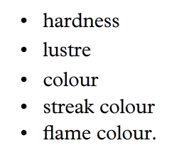 | 3 ways mineral can be analysed | By color, by lustre and by the streak. |