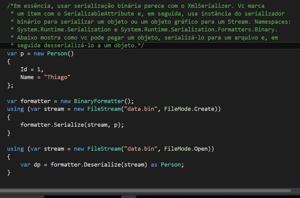 | Qual a diferença entre serialização de XML e binária? | O XmlSerializer tem saída de texto legível. Vc pode abrir no bloco de notas para inspecionar e editá-lo. Mas a legibilidade humana do arquivo tb acrescenta ao seu tamanho. Usando um formato binário, vc terá um resultado menor. Vc tb pode serializar dados que não é adequado para um formato XML, como uma imagem. Usar serialização binária parece com o XmlSerializer. Vc precisa marcar um item com o SerializableAttribute e, em seguida, usar instância do serializador binário para serializar um objeto ou um objeto gráfico para um Stream Serialização binária cria um fluxo (stream) compacto de bytes. Uma coisa que é diferente em comparação com a serialização XML é que os campos privados são serializados por padrão. Outra coisa é que durante a desserialização, nenhum construtor é executado. Você tem que levar isso em conta quando se trabalha com a serialização binária. |