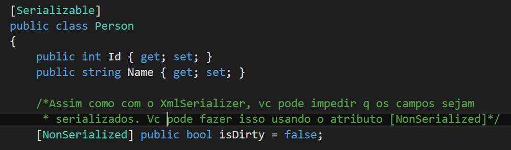 | Qdo o serializador binárionão pode encontrar um campo específico | Serialização binária é mais rigorosa do que a serialização XML. Qdo o serializador XML não pode encontrar um campo específico, não irá lançar uma exceção; ela só vai definir a propriedade para o valor padrão. O serializador binário não vai te perdoar. Por isso, é importante ser capaz de influenciar o processo de serialização |