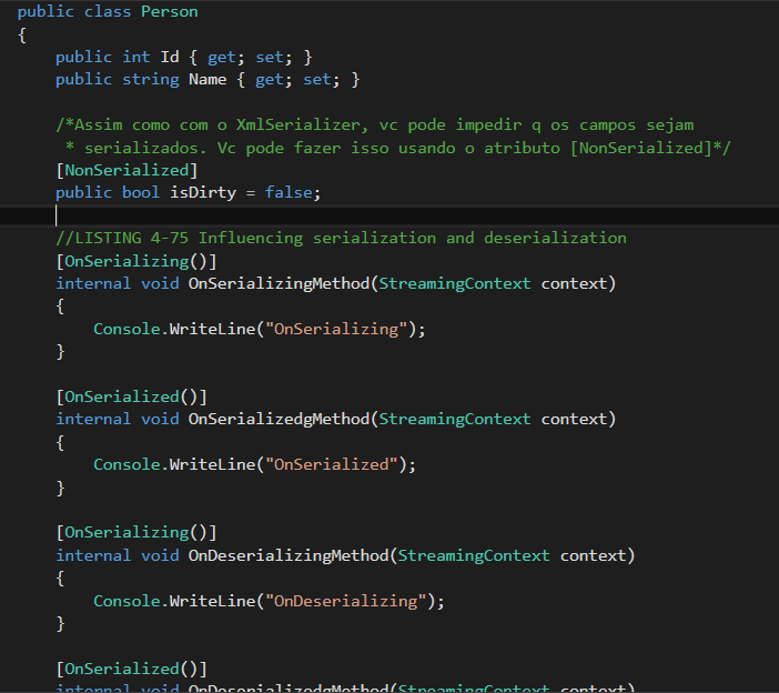 | Você pode influenciar o processo de serialização e desserialização em quatro fases específicas usando 4 atributos: | Você pode influenciar o processo de serialização e desserialização em quatro fases específicas, quando começar e terminar uma ação. Você pode fazer isso usando as quatro seguintes atributos: ■ OnDeserializedAttribute ■ OnDeserializingAttribute ■ OnSerializedAttribute ■ OnSerializingAttribute |