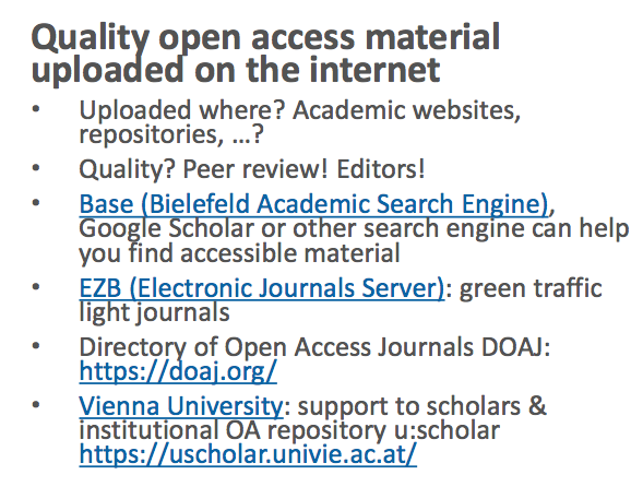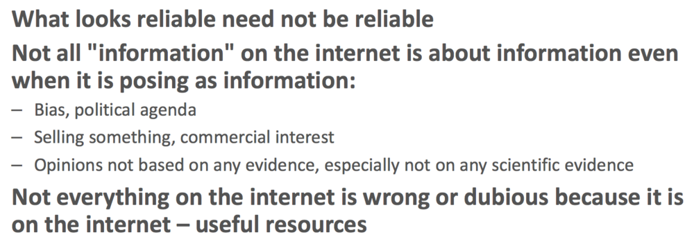 | Some more evaluation criteria* | • Who is the author and can he or she be contacted? Read “About Us” or “Contact Us”. • Is the author an expert, authority or known institution? [...] • How is the design of the website? When was it published and when was it updated? How up-to-date are the links? How is the writing style? Is there advertising? • What is the goal of the website? How detailed is the information? Is there a glossary? • Examine links to and from the website. Searchoperator link:URL finds pages that link to a certain page, e. g. link:www.saferinternet.at[...]. • Look up references. |
