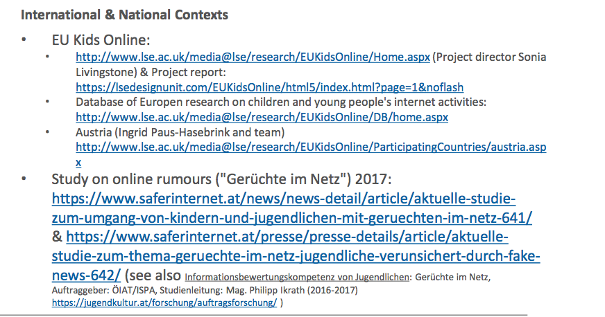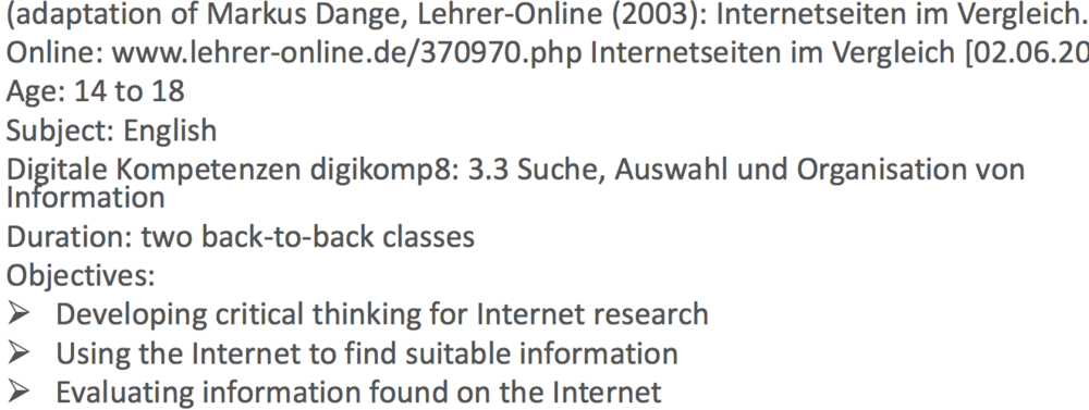 | Teaching Materials from Saferinternet.at "The source check" | Unterrichtsmaterial. Wahr oder falsch im Internet? Informationskompetenz in der digitalen Welt. Unterrichtsmaterialien. p.17 https://www.saferinternet.at/fileadmin/files/Materialien_2014/ Wahr_oder_falsch_im_Internet.pdf May 21st 2017. • "information and coordination centre for safer internet use and media competence in Austria" • "safer use of digital media" • "special focus on children, youth, parents and educators" • "free school resources and booklets, workshops and helpline services" |