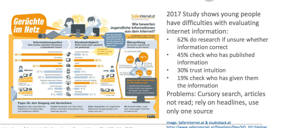 | Further findings | • Study shows young people have difficulties with evaluating internet information: 86% at least sometimes unsure whether information correct or not; 38% often or very often unsure; 61% see information evaluation as a great challenge • Images and especially aesthetic images seen as trustworthy (if aesthetic more trustworthy than if not) Study = representative online survey of 400 teenagers (14-18 years old); 6 in-depth interviews |