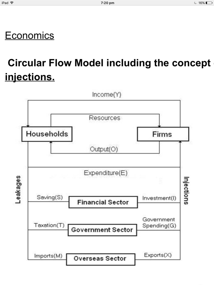 | What are leakages and give examples? | Leakages is when money leaves or is loss in the economy (Eg. Tax, savings, imports) |
