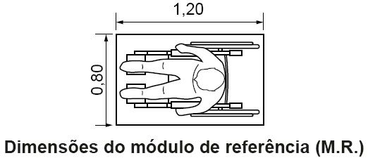 | Conforme a NBR 9050/2004, o que é MÓDULO DE REFERÊNCIA? | Considera-se o módulo de referência a projeção de 0,80 m por 1,20 m no piso, ocupada por uma pessoa utilizando cadeira de rodas motorizadas ou não. |
