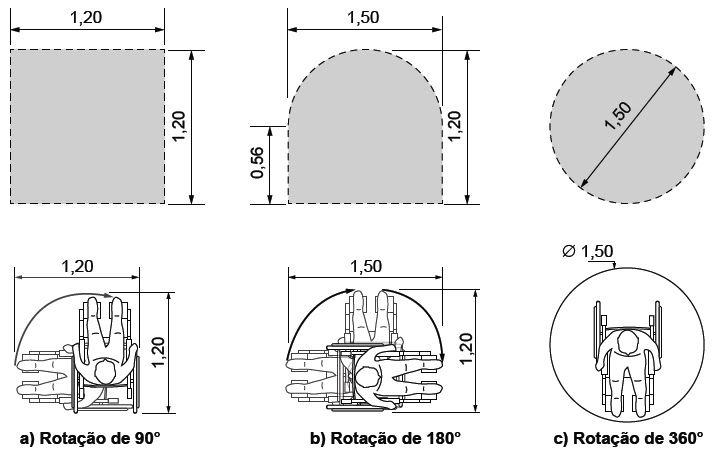 | Qual a área para manobra de cadeiras de rodas sem deslocamento para rotação de : 90, 180 e 360 graus? | |
