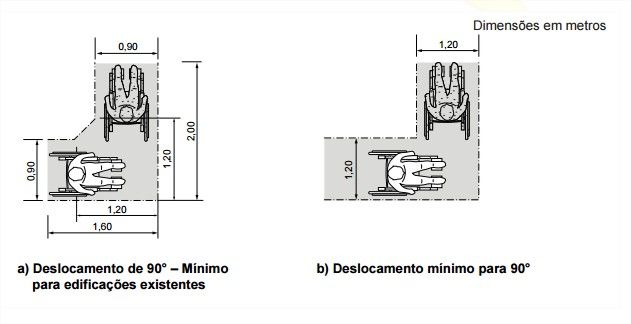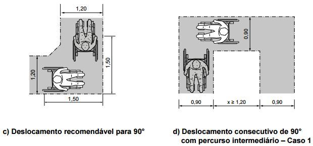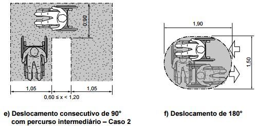 | Para as manobras com rotação de 90º, 180º e 360º são necessárias, respectivamente, as seguintes medidas: (A) 1,20 m x 1,20 m; 1,50 m x 1,20 m e diâmetro de 1,50 m. (B) 1,20 m x 1,10 m; 1,20 m x 1,10 m e diâmetro de 1,50 m. (C) diâmetro de 1,20 m; 1,50 m x 1,20 m e diâmetro de 1,50 m. (D) diâmetro de 1,20 m; diâmetro de 1,20 m e diâmetro de 1,50 m. (E) diâmetro de 1,20 m; diâmetro de 1,40 m e diâmetro de 1,50 m. | (A) 1,20 m x 1,20 m; 1,50 m x 1,20 m e diâmetro de 1,50 m. |