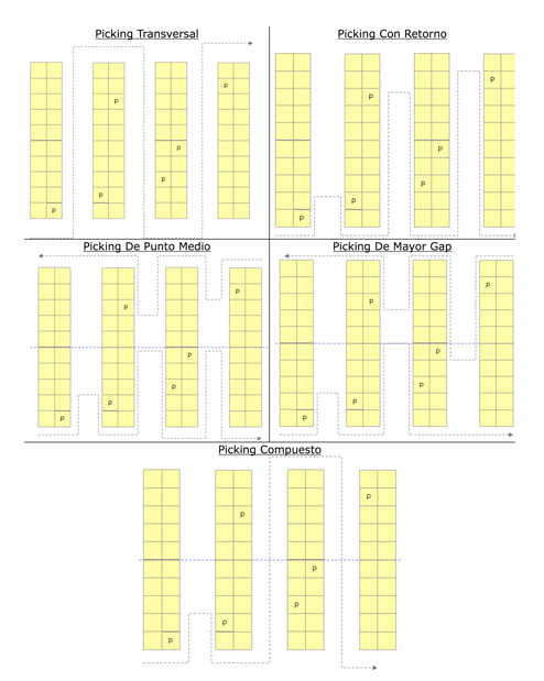 estrategias de picking transversal y con retorno. El método de picking compuesto minimiza la distancia