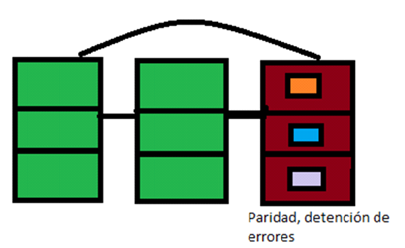 La informacion se distribuye en 2 de los volumenes dinamicos a nivel de bytes y 1 se dedica a la deteccion y correccion de errores.