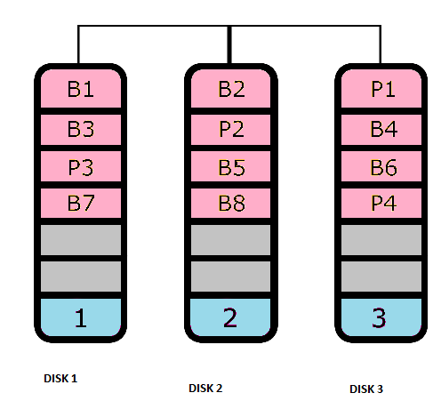 La informacion se distribuye por bloques en los discos, pero los datos de paridad se dristribuye en los 3 volumenes de forma distribuida.