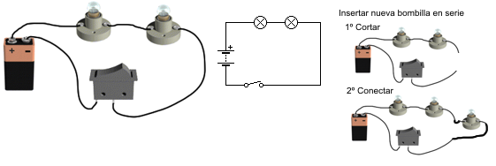 Los circuitos en serie son aquellos que disponen de dos o más operadores conectados uno a continuación del otro, es decir, en el mismo cable o conductor. Dicho de otra forma, en este tipo de circuitos para pasar de un punto a otro (del polo - al polo +), la corriente eléctrica se ve en la necesidad de atravesar todos los operadores.